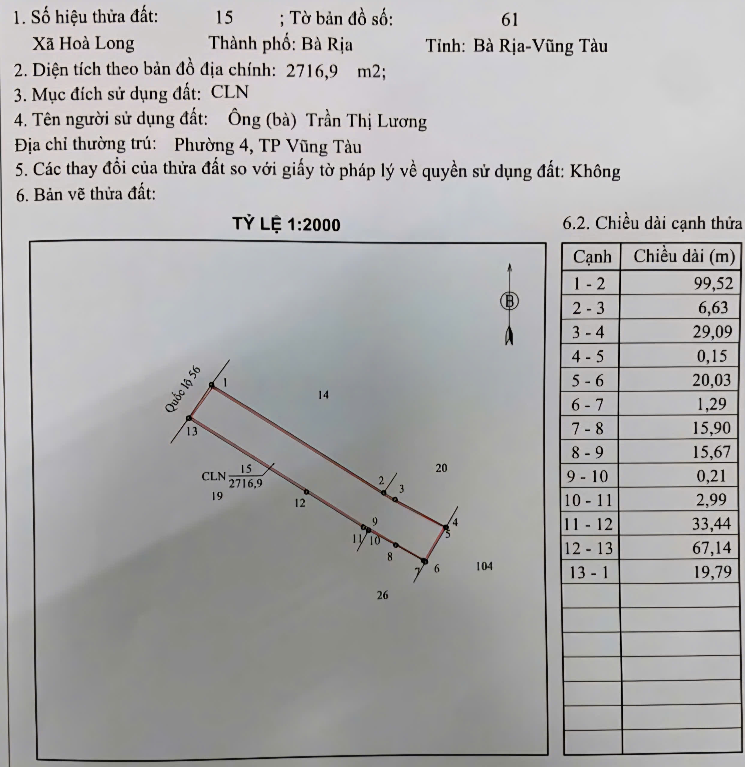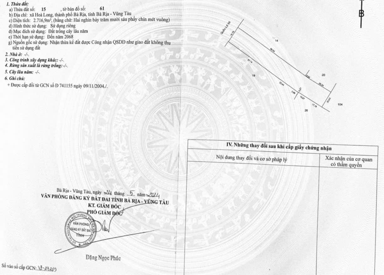 bán 2716m đất mặt tiền quốc lộ 56 xã hòa long brvt giá 28 tỷ.