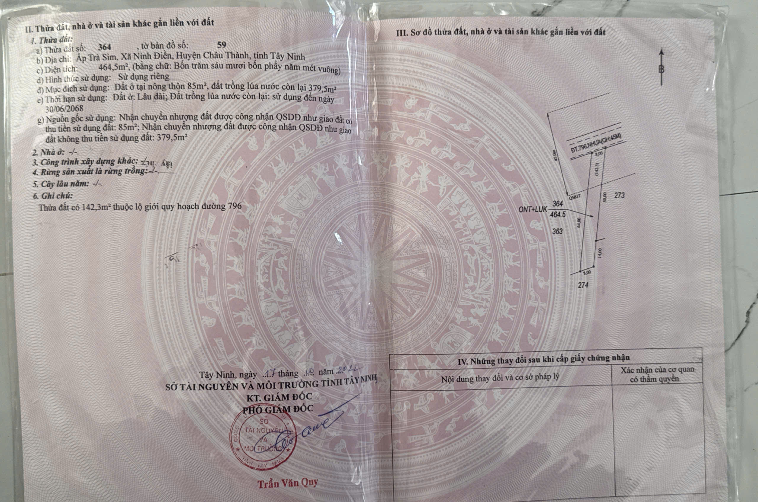- Tổng diện tích: 464.5m². Có 85m² đất ở tại nông thôn, 379.5m² đất nông nghiệp