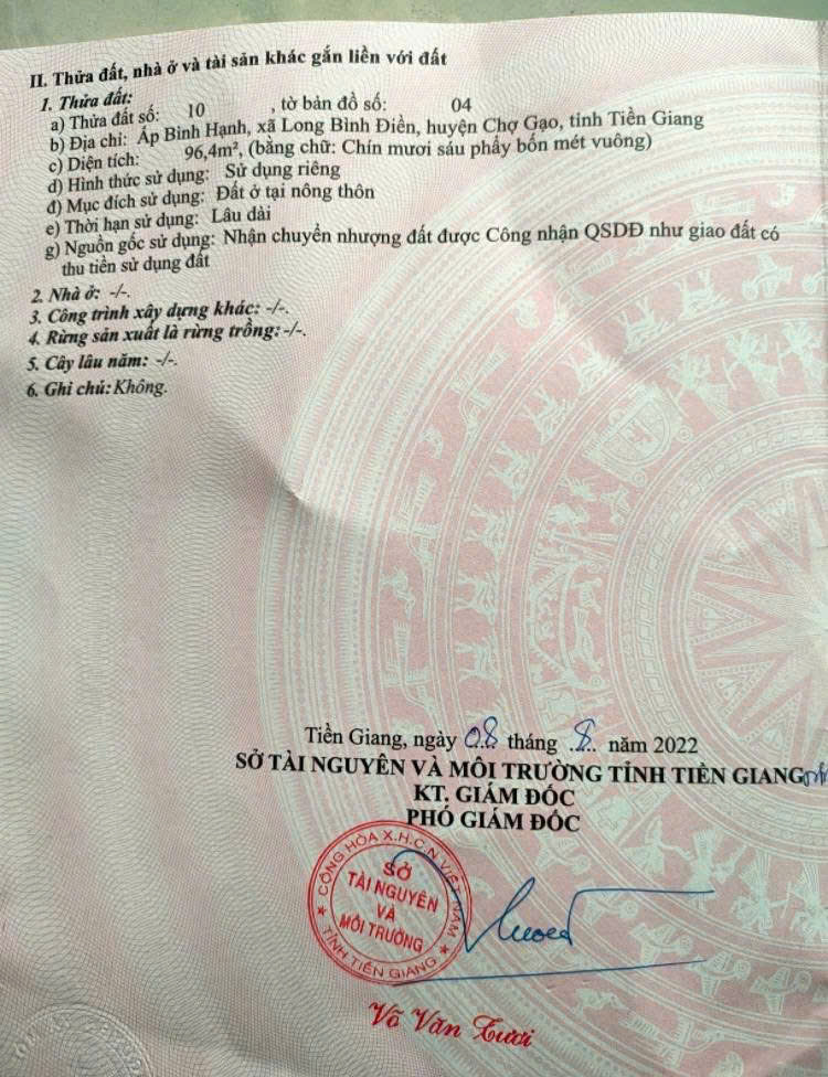 Em cần ra đi miếng đất tại xã Long Bình Điền ,Tiền Giang cũ , nay là Xã Chợ Gạo , Tỉnh Đồng Tháp mới - Diện tích 96,4 m2 , chiều dài vô 5,7m mặt tiền đường 18m , full thổ cư . - Giá 650 triệu có thương lượng. - SỔ HỒNG CẦM TAY , PHÁP LÝ RÕ RÀNG - Điện nước wifi tới đất . - Khu dân cư đông đúc, an ninh tốt,đẩy đủ mọi tiện ích xung quanh. - Đất cách quốc lộ 50 chỉ 20m , đường đan 4m , xe 4 chỗ ,16 chỗ vi vu . - Cách vòng xoay Chợ Gạo , trung tâm y tế Chợ Gạo chỉ 100m . - Gần thế giới di động , điện máy xanh , - Gần vực buôn bán sầm uất, gần chợ, trung tâm hành chính, trường học . -Phù hợp ở hoặc đầu tư sinh lời cao. Liên hệ chính chủ Gia Bảo:0707.867.687. để đi xem đất