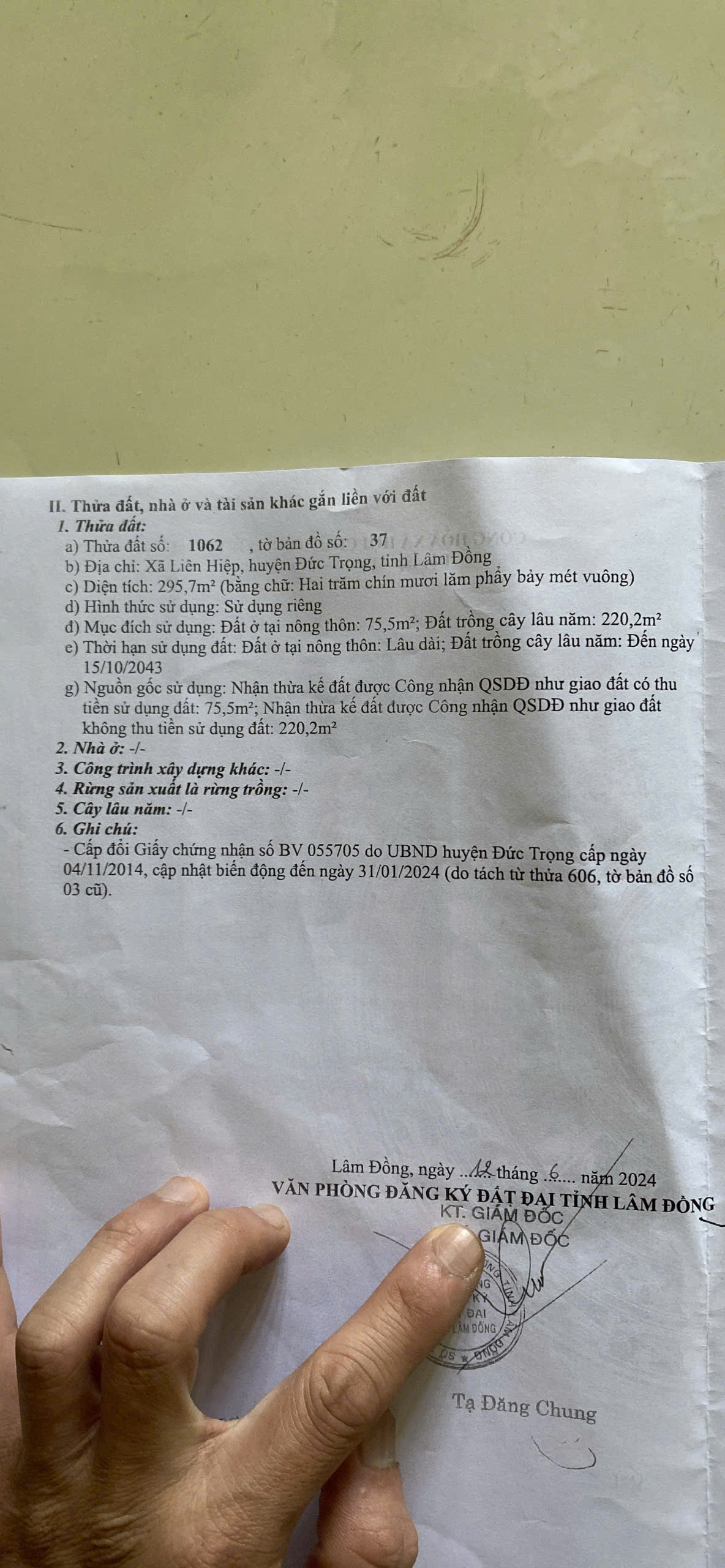 Bán Đất Liên Hiệp, Đức Trọng, Lâm Đồng. - Diện tích: 295.7m2, 75.7m2 đất ở - Sổ hồng riêng - Giá bán 700tr/m ngang - khu vực dân cư đông đúc, an ninh tốt - Đầy đủ mọi tiện ích xung quanh - Gần chợ, trường học bệnh viện... - Đường rộng , thuận tiện giao thông đi lại các hướng - Phù hợp ở hoặc đầu tự sinh lời cao Liên hệ: 0375795995 K tiếp QC