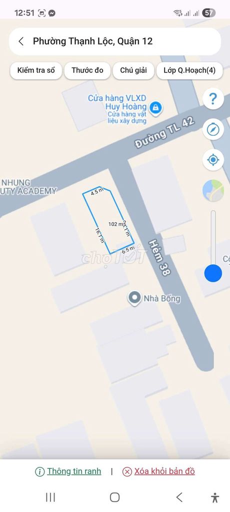 cần bán gấp lô đất đường TL 42, Phường Thạnh Lộc, Quận 12 tp hcm - Đất full thổ cư, 6,5x16=102,4m2, diện tích sử dụng 6,5x18 - Có sổ riêng. - Đất 2 mặt tiền. hướng tây bắc. - Giá bán 5,75 tỷ bớt lộc cho khách thiện chí - Đường 6m, thuận tiện giao thông đi lại các hướng - Khu vực trung tâm, an ninh tốt, đầy đủ mọi tiện ích xung quanh - Gần chợ, trường học, bệnh viện.. - phù hợp ở hoặc đầu tự sinh lời cao. mình cần xem đất xem sổ liên hệ chính chủ số 0976307879 chị giàu.