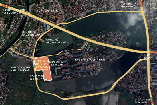 Từ đường Quốc lộ 1A, chúng ta có thể hướng tầm mắt tới bán đảo Linh Đàm nơi mà thiên nhiên đã ban tặng cho con người cây xanh và mặt nước. Tổ hợp nhà ở cao tầng CC6 với diện tích đất 50290 m2: phía Bắc giáp với hồ Linh Đàm, phía Nam giáp với công viên Quận Hoàng Mai, phía Đông giáp với hồ, phía Tây giáp đường Nguyễn Hữu Thọ.