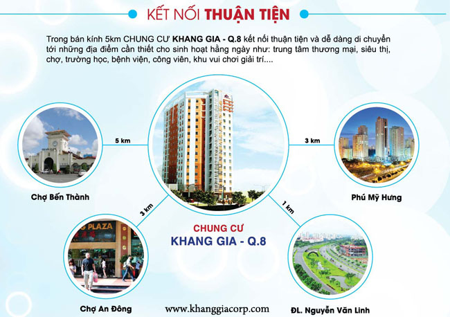 Với vị trí đắc địa đó sở hữu Chung cư Khang Gia Quận 8 Quý khách hàng chỉ mất 5 phút để đến quận 5, chợ An Đông qua tuyến đường Phạm Hùng, Nguyễn Tri Phương, và cũng chỉ mất 15 phút để đến quận 1 Chợ Bến Thành qua cầu chữ Y và cũng với 5 phút quý khách hàng có thể đển ngay trung tâm Quân 7 , khu Trung Sơn , Biệt thụ HimLam, Sunrise City. Vị trí cũng giúp giao thông thuận tiện dễ dàng kết nối Phú Mỹ Hưng qua Đại Lộ Nguyễn Văn Linh...