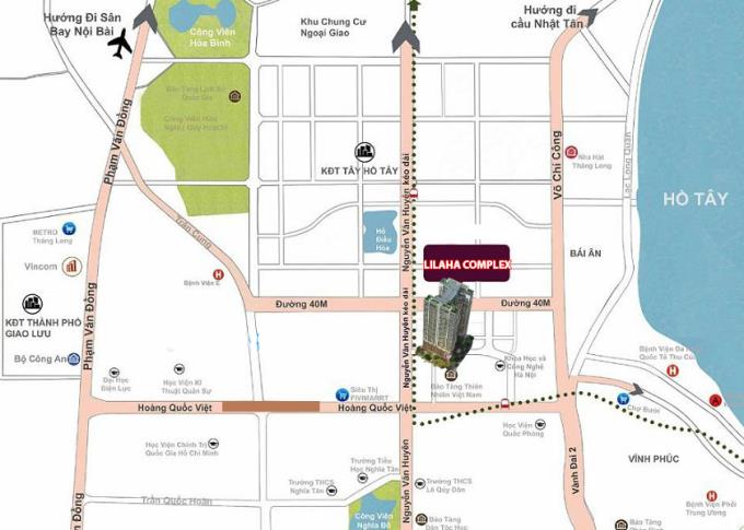 Lilaha Complex tọa lạc trên ô đất D3-CCDT10, phường Xuân La, quận Tây Hồ, TP Hà Nội. Đây được xem là một trong những vị trí đẹp nhất thủ độ khi vừa thừa hưởng cơ sở hạ tầng, đường xá phát triển của khu vực Tây Hồ Tây... vừa thừa hưởng toàn bộ không gian trong lành cùng cảnh quan thanh bình của quận Tây Hồ - Mảnh đất linh thiêng hội tụ toàn bộ tinh hoa khu vực phía Bắc Hà Nội. Chung cư Lilaha Complex này nằm trên trục đường Nguyễn Văn Huyên kéo dài có đường kính lên tới 40m.