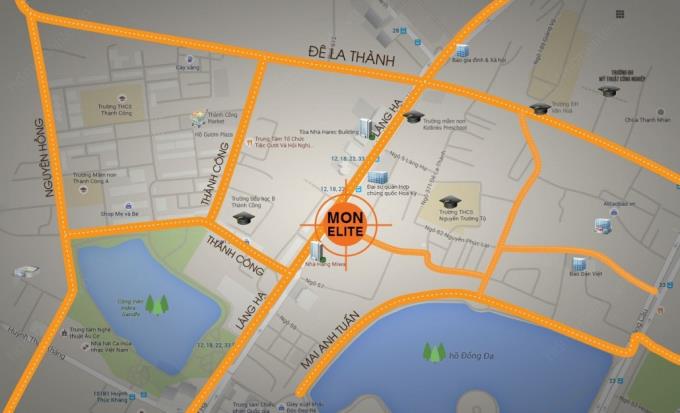 Chỉ mất chưa đến 10p để có thể di chuyển đến Hồ Gươm trái tim của thủ đô Hà Nội , ngay bên cạnh là đại sứ quán Mỹ, Khách Sạn Fortuna, Rạp chiếu phim quốc giá .Gần nhiều trường từ tiểu học cho đến đại học : Tiểu học Thành Công , THCS Nguyễn Trường Tộ,Đại học Văn Hóa Đại Học Luật. Đi bộ có thể ra đến hồ Đống Đa , hồ Thành Công.