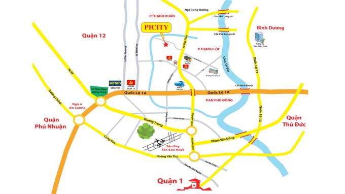 Dự án Căn hộ PiCity nằm ngay khu vực trung tâm của Quận 12 nên việc kết nối với các địa điểm trong yếu sung quanh vô cùng dể dàng và nhanh chóng: