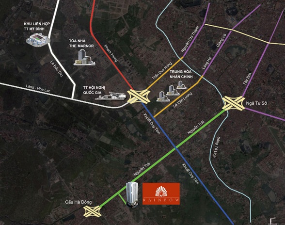 Chung cư Rainbow nằm ngay chính giữa trung tâm của khu đô thị mới Văn Quán – Hà Đông. Cách ga tàu điện trên cao Hà Đông – Cát Linh chưa đầy 200m. Cách trung tâm thủ đô 9km và có thể di chuyển theo nhiều trục đường lớn như Nguyễn Trãi – Tây Sơn; Lê Văn Lương – Láng Hạ; Trần Duy Hưng – Nguyễn Chí Thanh. Kết nối giao thông thuận tiện với tuyến đường Khuất Duy Tiến – Phạm Hùng tới bến xe Mỹ Đình, sân bay Nội Bài.