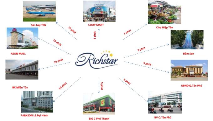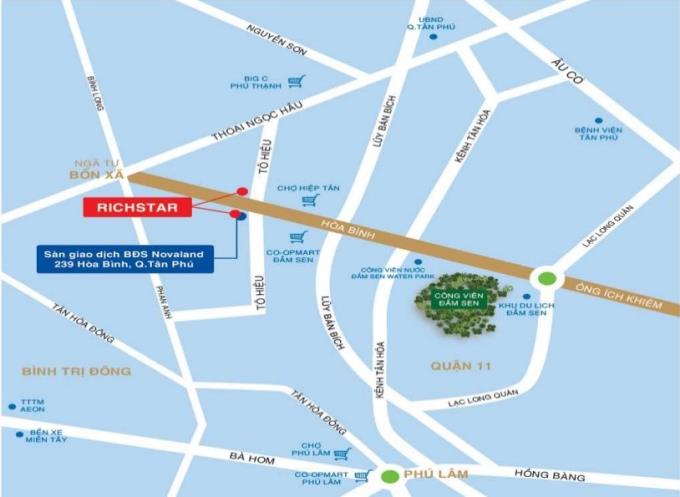Chung cư Richstar là nới có vị trí liên kết cực kỳ tốt cho bạn vì nó vì nó thuận tiện cho việc đi lại từ các quận trung tâm: Q. Tân Bình, Q. 10, Q. 11, Q 1 … và đặc biệt hơn cả là nó lại nằm gần khu du lịch Đầm Sen là 1 trong những khu vui chơi giải trí được ưa chuộng tại Tp. HCM. Nhưng đối với căn hộ chung cư Richstar thì khác, bạn sẽ sở hữu ngay cho mình 1 căn hộ tuyệt đẹp nẳm toạ lạc trên đường Hòa Bình của Q. Tân Phú, nằm ngay góc đường Hòa Bình và Tô Hiệu và là 1 trong vị trí khá đẹp của tuyến đường này.
