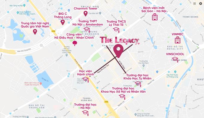 Vị Trí The Legacy nằm tại số 106 Ngụy Như Kon Tum, ngay ngã tư giao cắt với đường Lê Văn Thiêm. Đây là khu đất vàng tại quận Thanh Xuân với tiềm năng phát triển đô thị cùng quy hoạch đồng bộ, chỉn chu. Từ dự án cư dân có thể dễ dàng di chuyển ra mọi ngả trung tâm thành phố qua các tuyến đường lớn như: Vũ Trọng Phụng, Nguyễn Huy Tưởng, Lê Văn Lương, Khuất Duy Tiến…