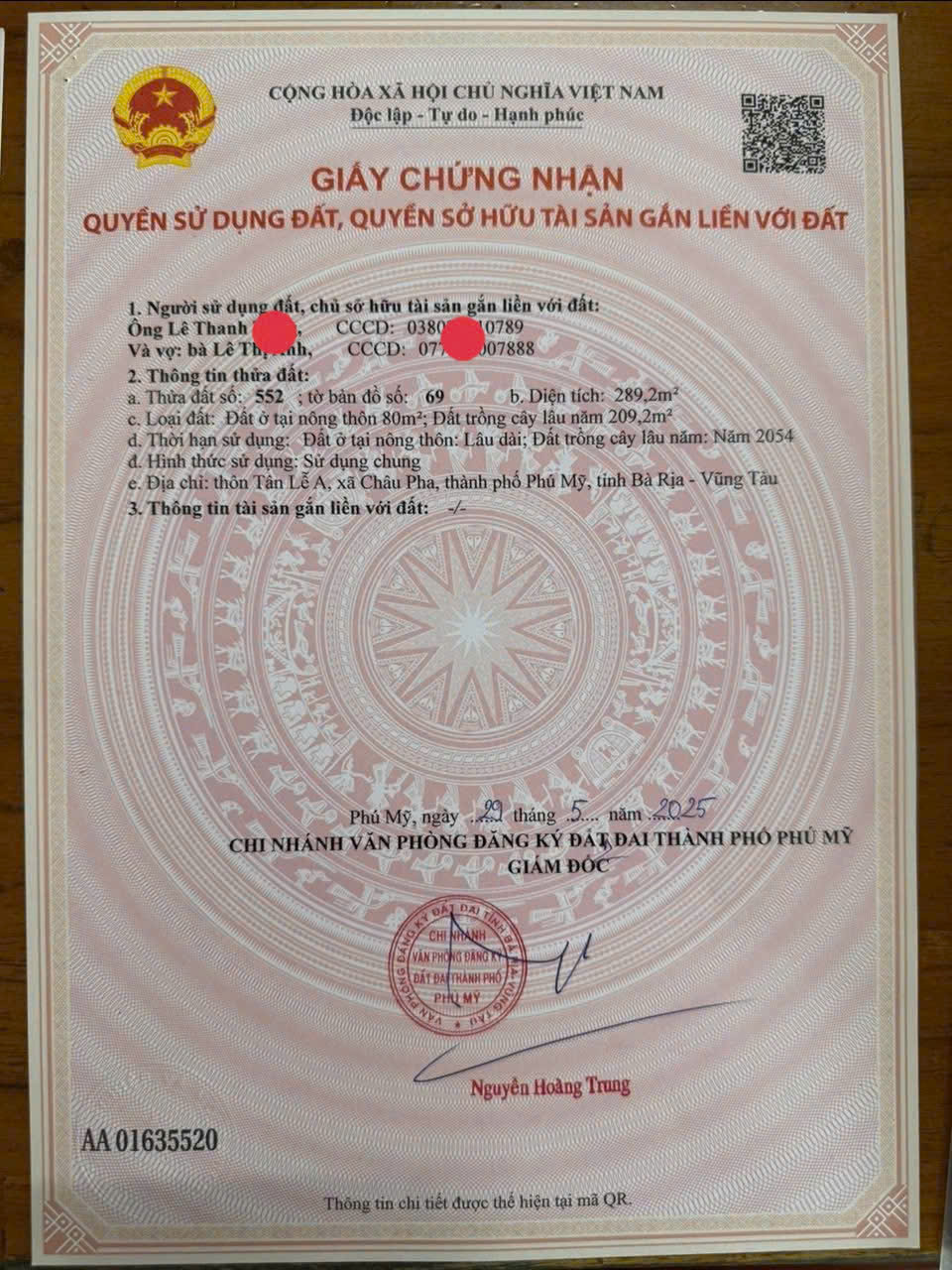 - Bán đất vườn hoặc cho thuê ( có sổ đỏ ) - Diện tích đất: 2.111m2. - Trong đó đất ở: 100m2. - Giá bán: 7,5 triệu/m2, tổng giá trị: 15,83 tỷ ( có thể bán 1 nửa ) - Giá cho thuê: 20 triệu / tháng ( toàn bộ diện tích ) - Địa chỉ: Đường Võ Trường Toản, phường Phước Hòa, TX Phú Mỹ, Bà Rịa Vũng Tàu. - Khu dân cư hiện hữu, an ninh đảm bảo. - Vị trí: Quốc lộ 51 rẻ đường bên trái Giáo Xứ Lam Sơn vào 850m ( Đối diện nhà 162 Võ Trường Toản ) - Cách chợ Lam Sơn khoảng 1km. Ra Khu Công Nghiệp Phú Mỹ 3 khoảng 7 phút di chuyển. Cách Sài Gòn khoảng hơn 1h chạy xe hơi. - Giấy tờ pháp lý rõ ràng sẵn sàng giao dịch. - Khu vực đất đang là điểm nóng đầu tư cơ sở hạ tầng cảng biển, logictic. - Đặc biệt, đất có phong thủy tốt, mang lại may mắn và tài lộc cho chủ nhân. Đây là cơ hội không thể bỏ lỡ cho những ai đang tìm kiếm một vị trí lý tưởng để làm nhà vườn hoặc đầu tư sinh lời. - Liên hệ chính chủ: Anh Vinh, số ĐT 0913 809 418