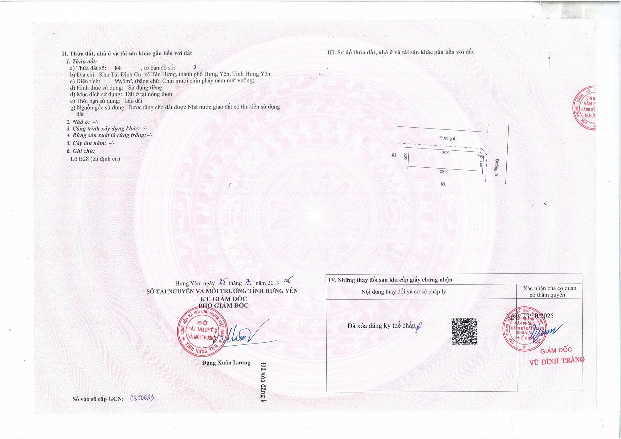 Đất nền tại KDC tái định cư Cầu Hưng Hà, Xã Tân Hưng, Hưng Yên (địa chỉ cũ: Thành phố Hưng Yên, Hưng Yên) với diện tích 99.5m2, thích hợp cho những ai đang tìm kiếm cơ hội đầu tư hoặc xây dựng nhà ở.