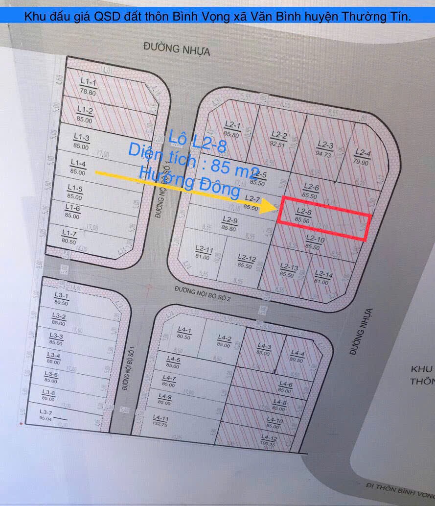 ĐẤT CHÍNH CHỦ- GIÁ TỐT Chính Chủ bán NHANH LÔ ĐẤT TIỀM NĂNG TẠI Huyện Thường Tín, Hà Nội Địa chỉ: Đường Quốc lộ 1A, Xã Văn Bình, Huyện Thường Tín, Hà Nội(Xã Thường Tín, Hà Nội mới) Diện tích: 85m2 Giá bán: 6,8 tỷ - Vị trí: L1 - 5 đấu giá BaDa Văn Bình Thường Tín, gần Quốc Lộ 1A, đường trước đất 6m vỉa hè 2m. - Xung quanh đầy đủ tiện ích gần chợ, bệnh viện ,trường học… - Khu dân cư thân thiện an ninh tốt - Giao thông thuận tiện đi lại dễ dàng - Pháp lý sổ hồng chính chủ, thủ tục nhanh chóng , cam kết không bị dính quy hoạch Thích hợp đầu tư lâu dài định cư sinh lời Mọi nhu cầu liên hệ chính chủ : 0869712345