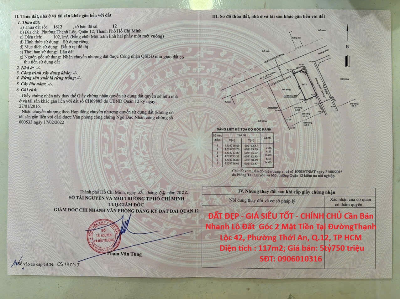 Vị trí: Đường Thạnh Xuân 25, P. Thạnh Xuân, Q.12 – kết nối nhanh ra Hà Huy Giáp, Quốc lộ 1A và trung tâm TP.HCM.Diện tích: 4.5m x 25m = 112,5m² – vuông vức, phong thủy đẹp, xây dựng tự do.Pháp lý: Sổ hồng riêng, sang tên công chứng ngay.Hạ tầng hoàn thiện: Đường nhựa rộng rãi, xe hơi ra vào thoải mái.Môi trường sống: Khu dân cư hiện hữu, an ninh tốt, hàng xóm thân thiện.Tiện ích xung quanh: Chợ, trường học, siêu thị, trung tâm y tế – tất cả chỉ trong vài phút di chuyển.Lợi thế: Vị trí tiềm năng, phù hợp xây nhà ở, cho thuê hoặc đầu tư lâu dài. Giá bán cực kỳ hợp lý so với mặt bằng khu vực. Giá chỉ: 4.4 tỷ – còn thương lượng nhẹ cho khách thiện chí. Liên hệ ngay: 0337 848 947 để xem đất thực tế và nhận tư vấn chi tiết. Lô đất đáng sở hữu cho ai đang tìm sự an tâm về pháp lý và giá trị đầu tư bền vững.