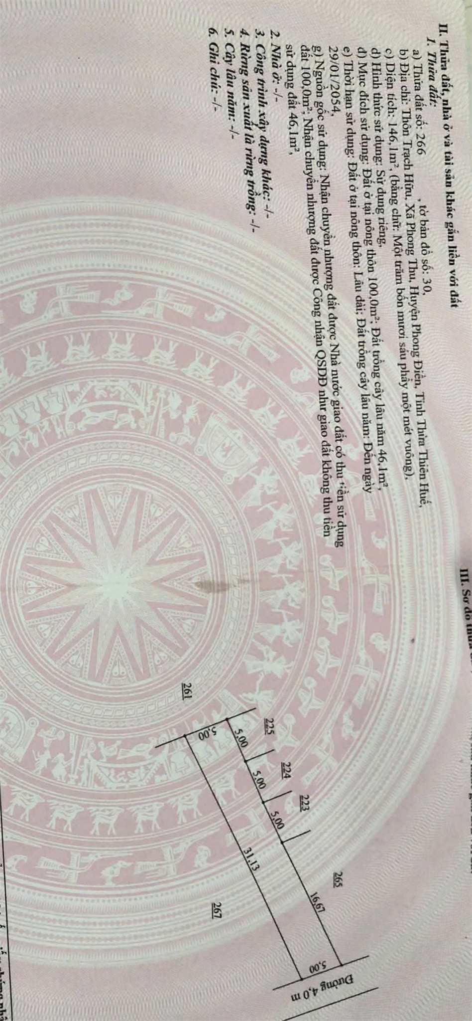 Diện tích: 146m2, ngang 5m dài 30m, thổ cư 100m2
