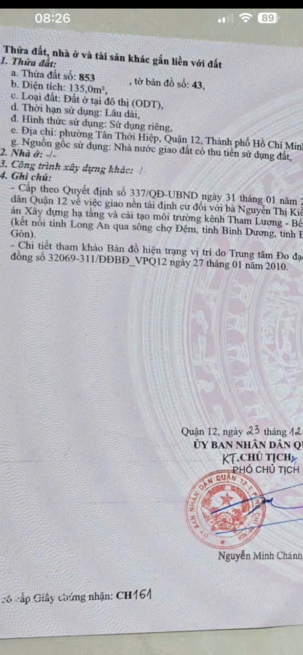 MẶT TIỀN HIỆP THÀNH 17 – NGANG 4M – XÂY 4 TẦNG – ĐỐI DIỆN TÒA VP LỚN P. Tân Thới Hiệp, Quận 12 – ngay giao Liên Khu 2-5 Đối diện tòa nhà văn phòng – khu kinh doanh sầm uất. DT: 4m x 26m – CN 104m² (thổ cư 82m²) Sổ hồng riêng – pháp lý chuẩn Hệ số xây dựng 4.0 – lên cao tối đa, tối ưu khai thác Khu nhà lầu xây kín – dân cư đông, nhu cầu thuê cao. Cách bến xe buýt HT17 ~300m – tiện di chuyển. Phù hợp: xây nhà phố, văn phòng, CHDV, đầu tư giữ tiền. Giá bán: 6.89 TỶ (TL) Gọi ngay Ms Mỹ - 0909.805.456 xem đất – vị trí đẹp, dễ xây cao, cơ hội đầu tư tốt!