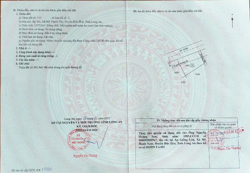 ĐẤT 2 MẶT TIỀN - ĐẦU TƯ LÀ SINH LỜI - Chính Chủ Bán 2 Lô Đất xã Mỹ Thạnh Bắc, Đức Huệ, Long An **Diện tích: 967,7m2. **Diện tích: 960,3m2. Giá bán: 4,2tỷ/lô(Có thương lượng) - Đất nằm ngay dự án đường tỉnh 822B đang làm, đường mặt tiền dự án 30m, dự kiến giữa năm 2026 là hoàn thành - Tiện ích xung quanh đầy đủ: gần chợ, trường học... - Dân cư đông đúc, an ninh đảm bảo - Pháp lý: sổ hồng chính chủ, sang tên nhanh chóng. - Tiềm năng: tăng giá trong tương lai gần Mọi nhu cầu liên hệ: 0909048041 chính chủ xem đất