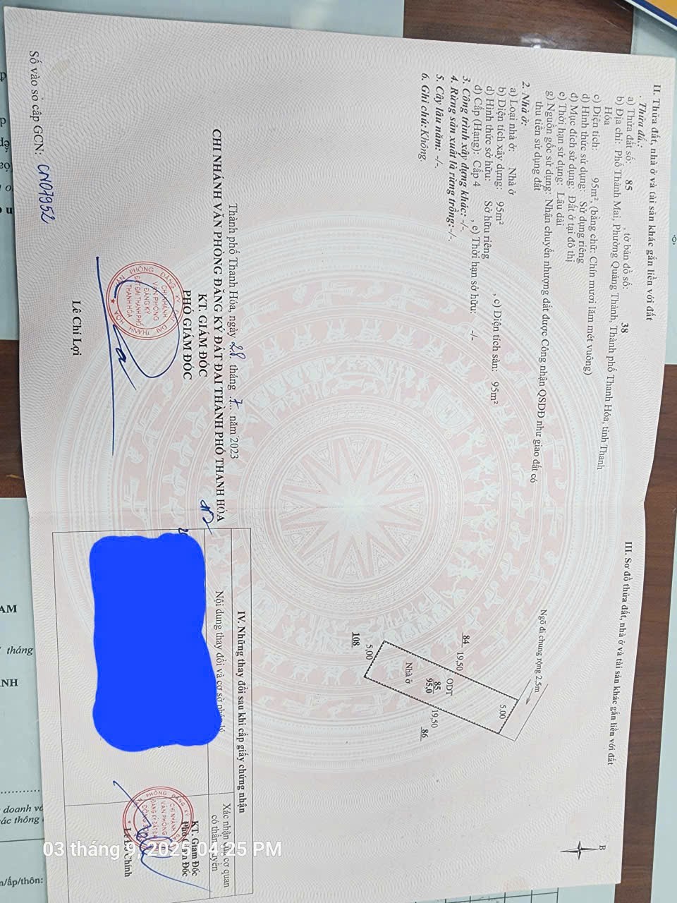 ** Diện tích: 95 m2 (đất ở cả thức tế sử dụng 123,6m2 )